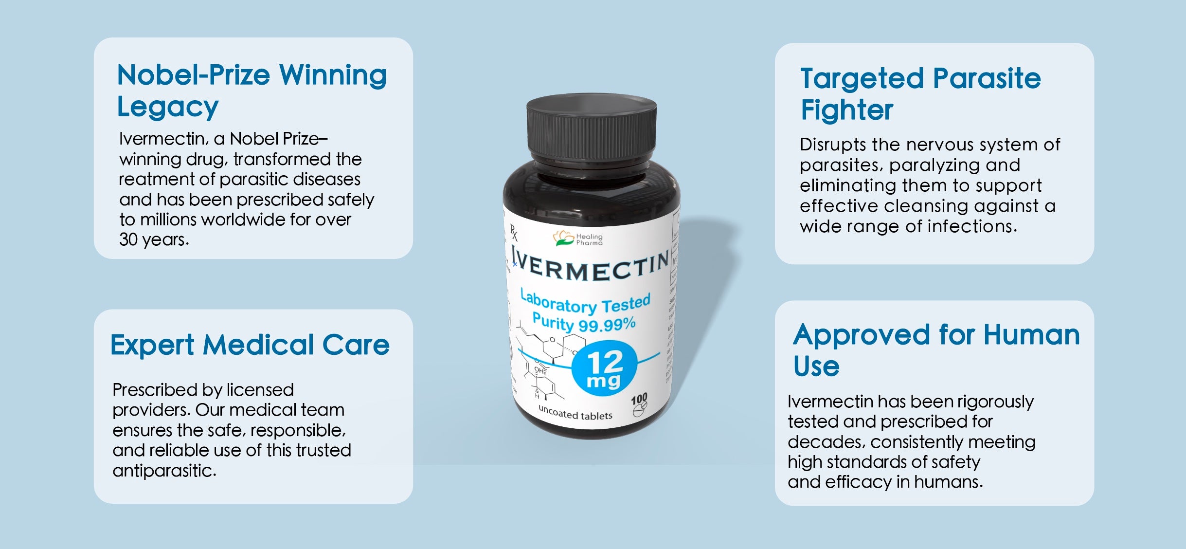 - Proven Antiparasitic Therapy — Prescribed globally for over 30 years and awarded the Nobel Prize in Medicine, Ivermectin eliminates a wide spectrum of parasites that impact health and wellbeing.